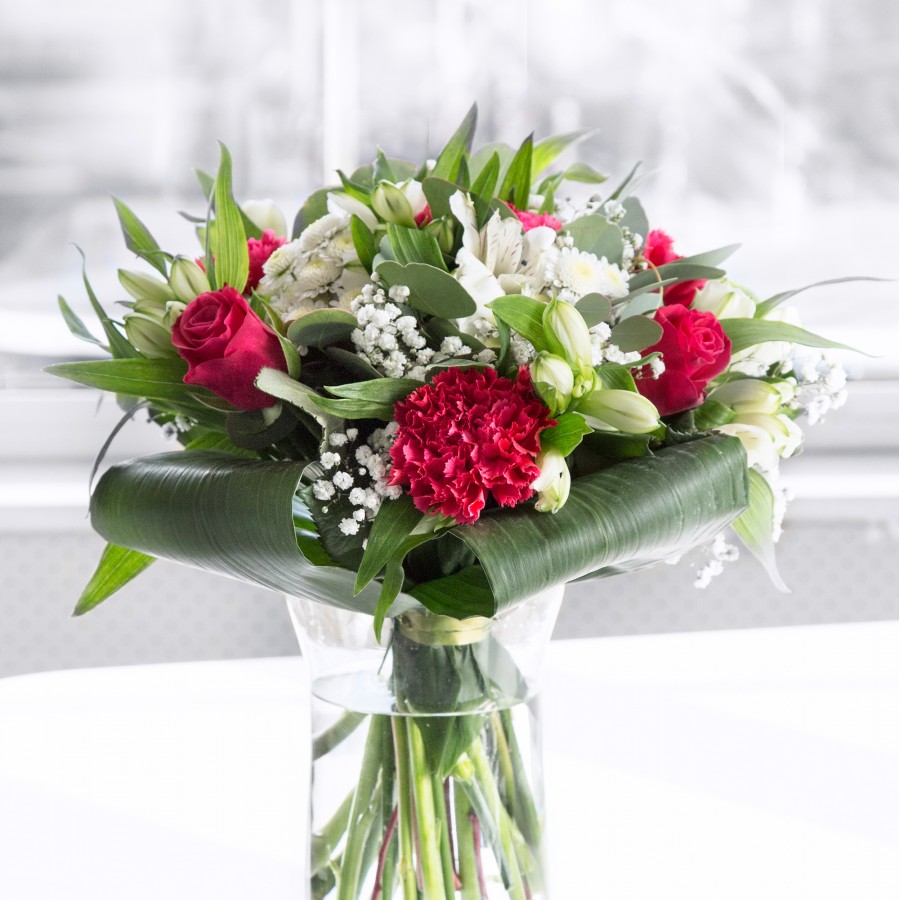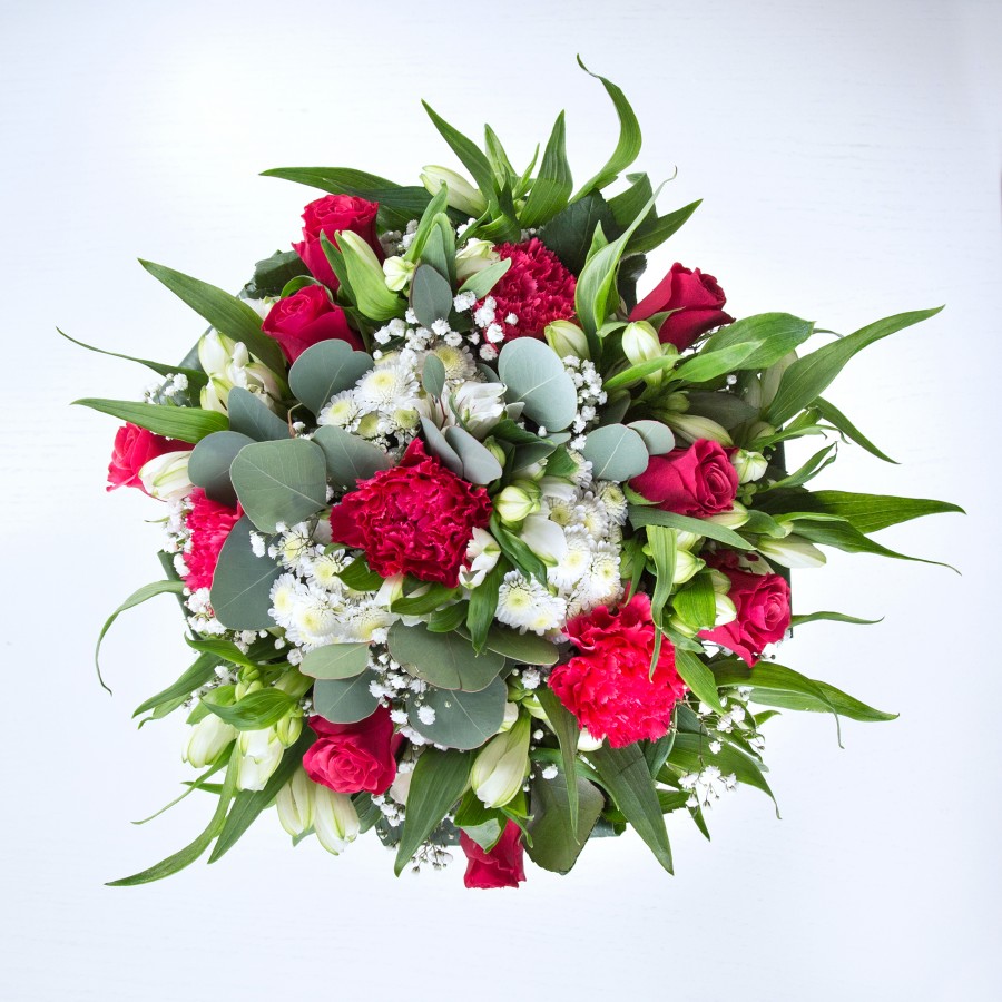 Immerse yourself in the beauty and uniqueness of our Elegant Bloom Bouquet. This stunning arrangement showcases vibrant red roses and delicate white chrysanthemums, harmoniously blended with airy gypsophila and pristine alstroemeria.